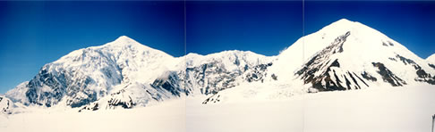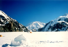 下山時に必要なもの等のデポ、ガソリンの受け取り、氷河徒行の説明があり、早速に出発。これで1日の遅れが回復できる。炎天下をアンダーシャツ1枚で歩く。標高差200mの下りでソリを上手く操作できず苦労した。C1のすこし手前に露営。このキャンプ地の景色はすばらしい。
