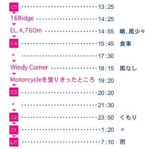 C1にはかなりの隊。露営の四ツ谷隊の側を通る。 L.P.へ快調に登る。 標高差3,400m、距離23km、時間約18時間は2年前の都岳連日本山岳耐久レースの約20時間に次ぐ長丁場である。天候が味方し登頂していた場合、同様に下山できたか疑わしい。 L.P.も隊の数が減っている感じ。小雨が降っており、すぐには迎えは来飛しないと考え、テントを張り、デポを掘り起こし、食事。迎えが来飛するとのレインジャーの話で撤収する。